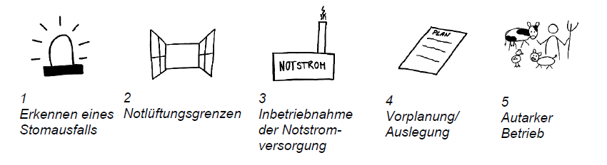 Besonders Betriebe mit zwangsbelüfteten Ställen müssen zeitnah handeln. Ist die Lüftung im Stall von einer elektrisch betriebenen Anlage abhängig, muss eine Ersatzvorrichtung vorhanden sein, die bei einem Stromausfall einen ausreichenden Luftaustausch gewährleistet. Außerdem muss eine Alarmanlage zur Meldung eines solchen Ausfalls installiert werden. Neben Lüftung, Fütterung und Alarmgeräten sollten auch Beleuchtung, EDV sowie die Telefonanlage an die Notstromversorgung gekoppelt sein. Wenn die Wasserversorgung über einen eigenen Brunnen erfolgt, muss die Wasserpumpe ebenfalls in die Notstromversorgung eingebunden werden.