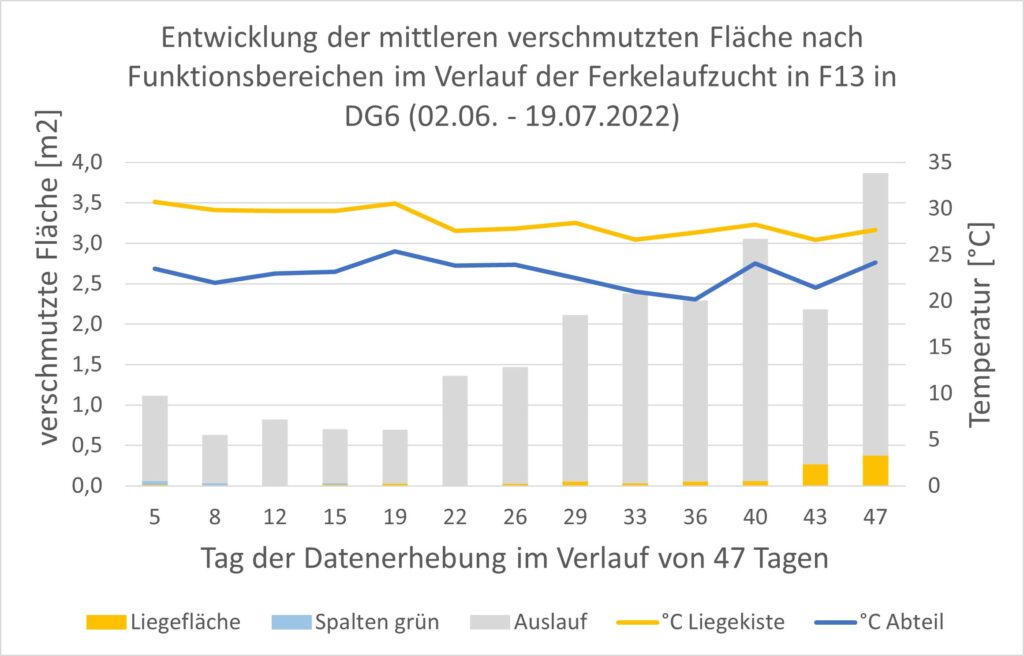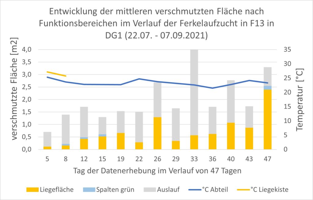 Die klimatische Attraktivität und Größe der Liegefläche sind wichtige Faktoren in der Steuerung der Buchtennutzung. In DG1 (s. Abb. 4) stand 20 Ferkeln eine abgedeckte Liegefläche von 4,5 m² uneingeschränkt zu Verfügung. Durch den Flächenüberschuss wurde die Liegefläche im hinteren Teil verschmutzt, was zu einem erhöhten Arbeitsaufwand, aber auch zu einer erhöhten Ammoniak-Konzentration in der geschlossenen Liegekiste führte. In DG6 wurde die Liegefläche durch eine zweite, verschiebbare Rückwand abgeteilt, somit stand den Ferkeln zu Anfang lediglich eine Fläche von 2,1 m² abgedeckter Liegefläche zur Verfügung, die für alle Ferkel ausreichend Platz zum Liegen bot, aber keinen Flächenüberschuss, der eine Kotecke erlaubte.