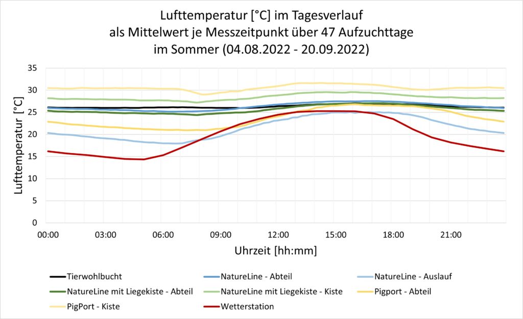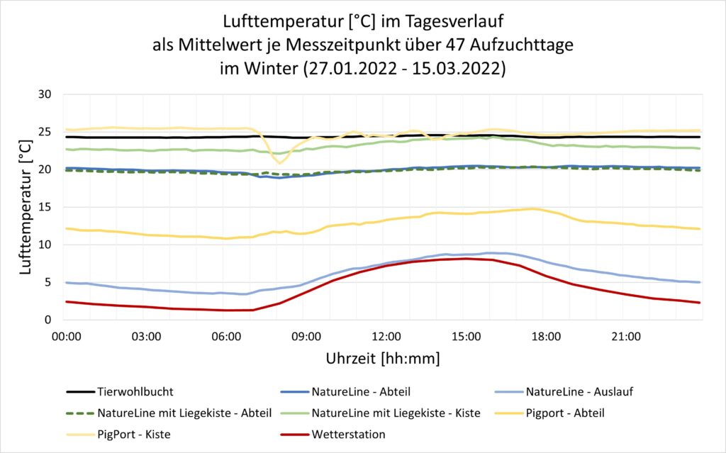 Der Einfluss des Außenklimas auf die Lufttemperaturen in den einzelnen Klimazonen wurde kontinuierlich erfasst. Gerade in den Wintermonaten stand zur Debatte, ob das hohe Wärmebedürfnis der frisch abgesetzten Ferkel erfüllt werden könne.