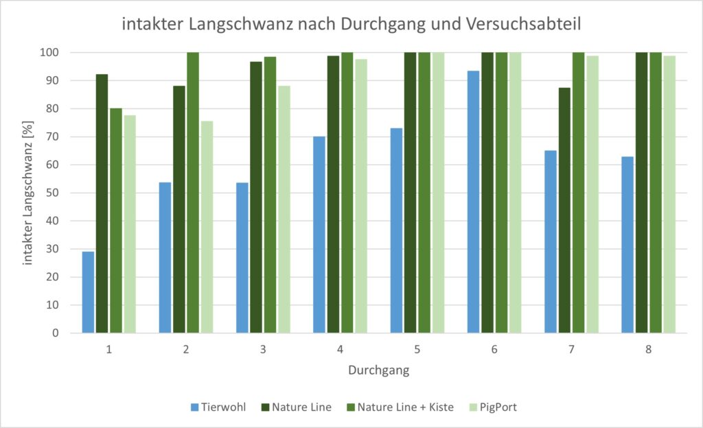 Der Anteil der unversehrten Ferkel in der Tierwohlbucht war mit 64,2 % deutlich geringer als in den alternativen Systemen mit im Mittel 95,8 %. Ebenso war der Anteil der leicht verletzten Ferkel, die sich in kurzer Zeit zu schwereren Verletzungen entwickeln könnten, in der Außenklimastallungen deutlich niedriger (0,4 %) im Vergleich zur Tierwohlbucht (4,5 %). Der Anteil von 20,4 % verkaufsfähiger, aber nicht als ‚Langschwanz‘ vermarktbarer Ferkel mit „abgeheiltem Längenverlust“ war in der Tierwohlbucht gegenüber den im Mittel 3,6 % in den Außenklimastallungen deutlich höher. Schließlich zeigte auch der Anteil der nicht verkaufsfähigen Tiere in der konventionellen Kontrollgruppe mit 11 %, im Vergleich mit den alternativen Systemen mit 0,1 %, weiterhin die Herausforderungen der Haltung unkupierter Ferkel in konventionellen Stallungen.