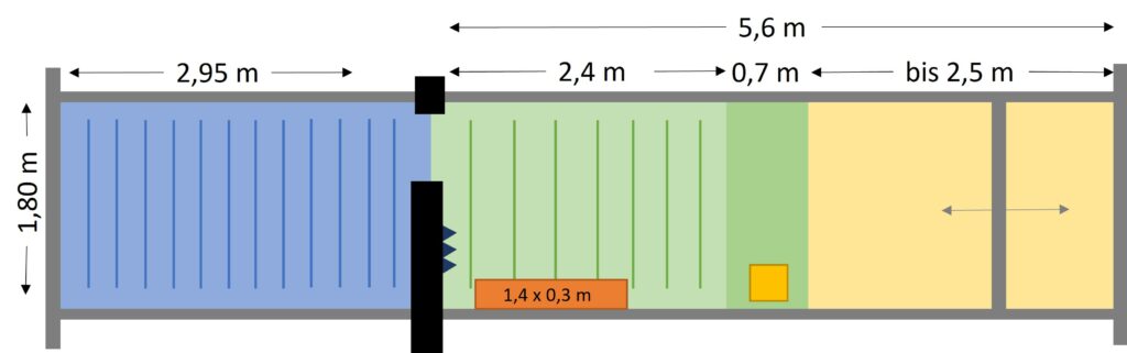 Die Buchten der alternativen Systeme sind lang und schmal gestaltet und in Funktionsbereiche gegliedert: eine beheizte, eingestreute Liegefläche (gelb) an die ein Fress- und Aktivitätsbereich (grün) und ein Kotbereich mit Außenklima (-reiz, blau) anschließt (Abb. 2). Die maximal verfügbare Fläche pro Ferkel entsprach ca. 0,7 m² in zwei bzw. drei Klimazonen. In den Nature Line Systemen befand sich lediglich die, entweder in der Größe veränderbare oder abgedeckte, Liegefläche im warmen Liegehaus; im eingehausten Auslauf mit Außenklimareiz die übrigen Funktionsbereiche (s. Abb. 1). Das PigPort-System hingegen ist ein Kaltstall mit einer beheizten Liegekiste, wobei der Auslauf keine weiteren Strukturelemente enthält und sich im Außenklima befand. Die konventionelle Kontrolle (Tierwohlbucht) verfügte über 0,5 m²/Ferkel, eine geschlossene, beheizte Liegefläche im Kunststoffrostboden und zusätzliches Beschäftigungsmaterial. In allen Abteilen stand eine ad. lib. Trockenfütterung und Nippeltränken sowie durchgehend Heu zur Verfügung.