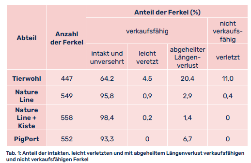 Die Tierverluste beliefen sich im Mittel über alle alternativen Stallungen auf 0,4 %, in der Tierwohlbucht auf 0,7 %. Dabei war zu beobachten, dass aus der Tierwohlbucht deutlich mehr Ferkel wegen Verletzungen des Schwanzes (4,3%) oder als „Beißer“ (1,8 %) in Krankenbuchten umgestallt werden mussten als in den Außenklimastallungen (je 0,1 %).